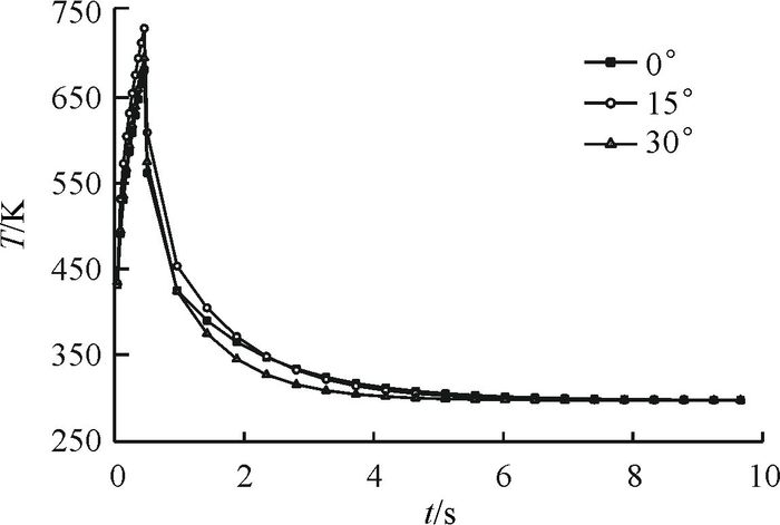 图 6 监控点A温度与水管截面倾角的关系 Figure 6 Variation of temperature in Point A by change of the end face structure of cooling water pipe |