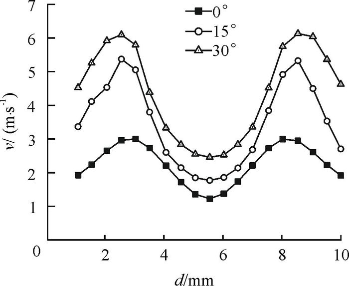 图 4 不同凹角下距冷却水管出口1.5 mm处水流速度 Figure 4 Variation of flow rate by change of concave angle in the bottom surface |