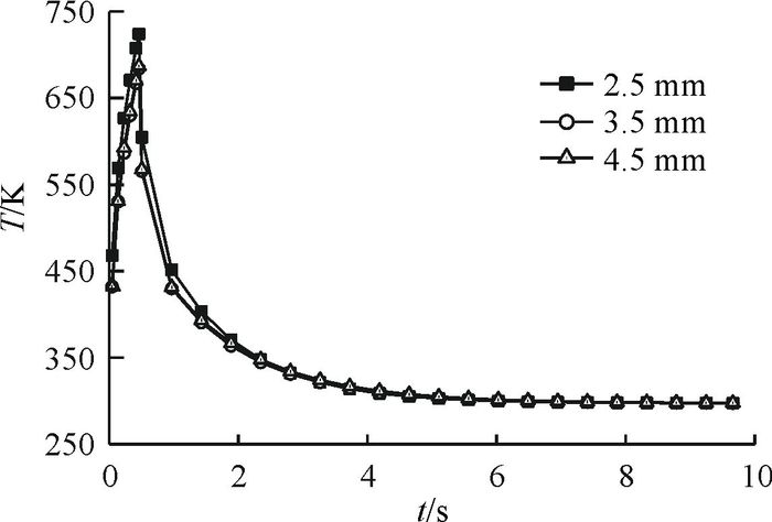 图 5显示出模型Ⅱ、Ⅳ、Ⅴ对应监控点温度的变化规律.从图中可以看出,随着冷却水管与冷却腔底距离的增加,监控点的温度呈上升趋势.当与冷却腔底距离为2.5 mm和4.5 mm时,同一时刻的最大温差接近10 K,同时,与冷却腔底距离为2.5 mm时,电极的完全冷却时间约提前0.5 s.