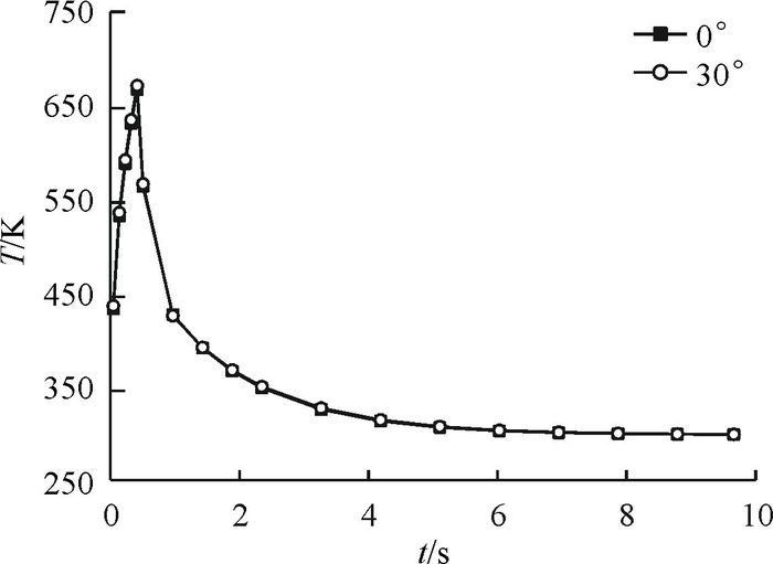 图 3揭示了模型Ⅰ、Ⅱ、Ⅲ对应监控点温度的变化规律.可以看出,随着凹角角度的增加,电极头的温度显著降低.当凹角角度为30°时,监控点的温度较0°时降低约25 K,电极完全冷却时间约提前0.5 s.从图 4可以得出,当凹角为30°时,各处的流体速度约为凹角为0°时流速的2.5倍.由此推测出凹角越大,冷却腔各部的水流速度越大,有利于强化流体与电极壁面的扰动,提高对流换热系数.当凹角继续增大时,由于冷却腔底与电极头端面的距离会变小,因而强化了电极的冷却能力.