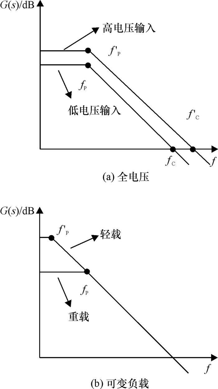 由图 2(a)可知,增加输入电压会使直流增益G(DC)和截止频率增加,但是输出极点不变;由图 2(b)可知,减轻负载会使直流增益G(DC)增加,输出极点减小,但是截止频率不变.