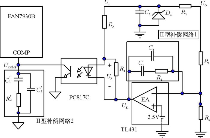 2.2 反馈补偿网络设计基于PC817A和TL431配合的反馈补偿网络设计如图 4所示.由于在设计中运用了TL431内部的反馈运算放大器,所以在光耦连接FAN7930B时, 略过了FAN7930B的INV引脚内部跨导运放, 直接把误差输入接FAN7930内部运放的输出端COMP引脚.这种设计可以把反馈信号的传输时间缩短一个放大器的传输时间, 使电源的动态响应更快[16].