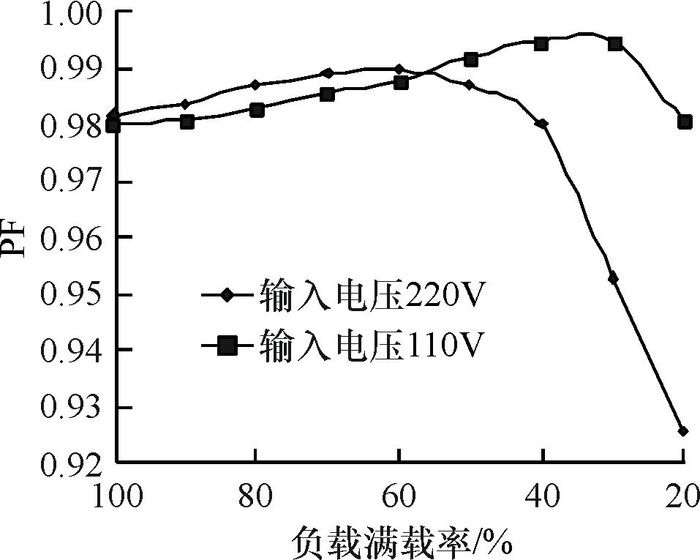 图 6 输入电压为220 V时负载变化下的PF Figure 6 Plot of power factor versus load |