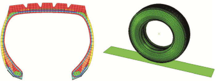 1 轮胎有限元模型建立及验证 1.1 轮胎模型建立及验证本文以载重子午线轮胎295/80R22.5为研究对象,利用有限元软件Abaqus,建立了轮胎有限元分析模型,如图 1所示.采用CGAX3H与CGAX4H单元模拟橡胶材料,采用SFMGAX1和REBAR单元模拟钢丝帘线.在分析中,路面定义为解析刚体,路面与轮胎之间的摩擦采用库伦摩擦定律描述.