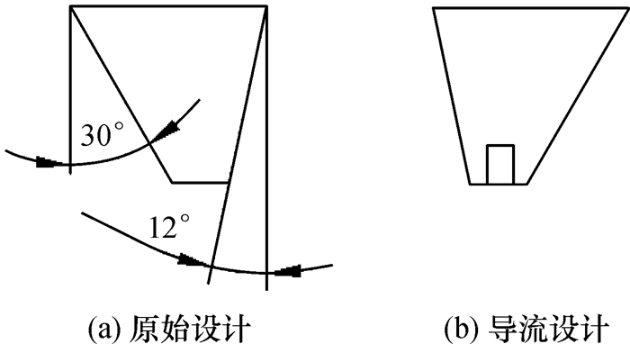 通过上述的分析结果显示,花纹泵浦噪声主要是由于空气流体对花纹壁面的冲击产生的动态压力引起的.为了使空气更稳定地流出花纹沟,在花纹沟中设置了导流结构,并与原始方案进行噪声性能对比分析.如图 10纵向花纹沟示意图,图 10(a)为载重子午线轮胎295/80R22.5原始设计的纵向花纹,花纹沟深为13 mm,侧壁角度分别为30°和12°.图 10(b)为在纵向花纹沟底设计导流结构.该导流结构宽为2 mm,高3 mm,这种结构可以引导空气的流动,减小气流对花纹壁面的冲击,进而可以降低泵浦噪声.
