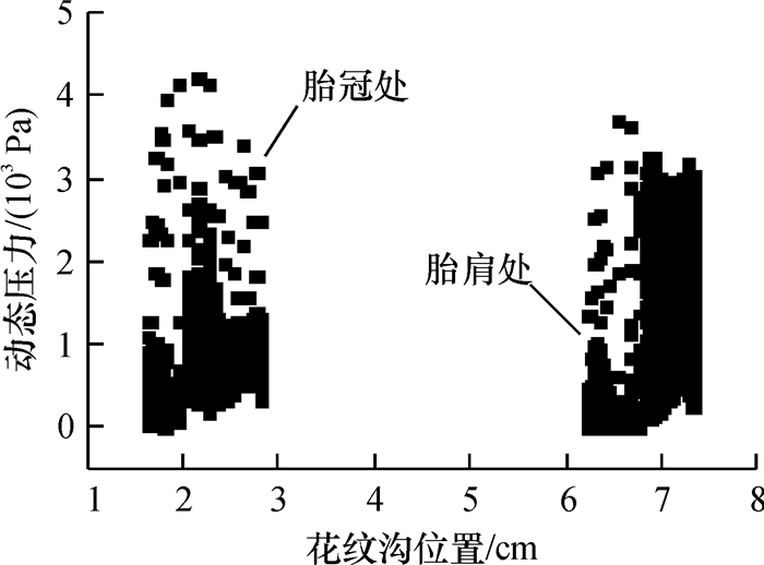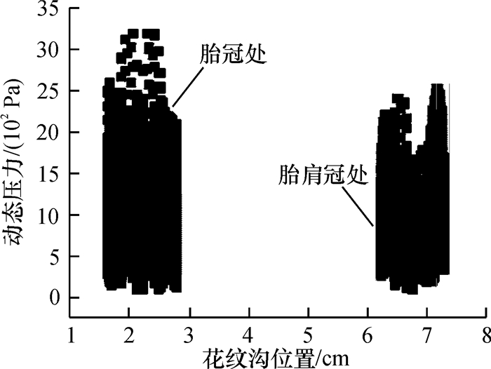 这主要是因为对于载重子午线轮胎,其接地分布压力主要集中在胎冠部位,从上述图 2接地分布压力试验结果可以看出,因此胎冠处花纹变形要大于胎肩处花纹,对空气的扰动更显著.而且对于胎冠处花纹在进口处的压力也大于胎冠处花纹;如图 9所示,为两处花纹壁面的动态压力散点图,同样反映出胎冠处花纹的动态压力较大,因此胎冠处花纹的噪声对花纹噪声能量贡献较大.