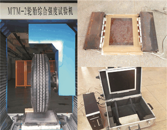 图 3 样品轮胎及试验设备 Figure 3 Sample tire, tire static loaded test machine and Tekscan |