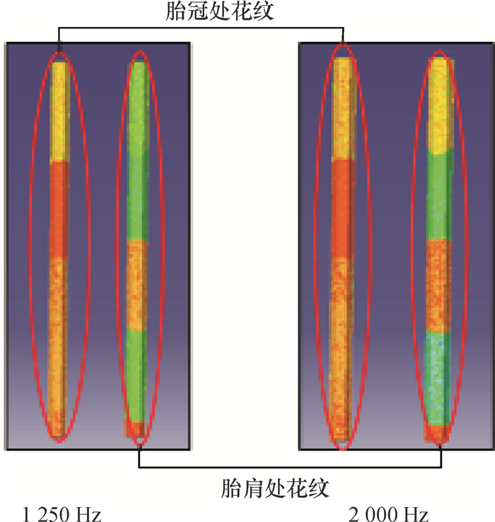 2.3 声源位置确定从上述图 7可以得出花纹的泵浦噪声的峰值在1 000 Hz和2 000 Hz处有明显的峰值,可以认为这两个频率是花纹泵浦噪声能量主要集中的频率,图 8所示,通过LMS声学软件显示在该频率处声源位置云图.可以看出,在纵向花纹沟槽中间段内是噪声主要集中的地方,而且胎冠处花纹的噪声明显大于胎肩处花纹的噪声.