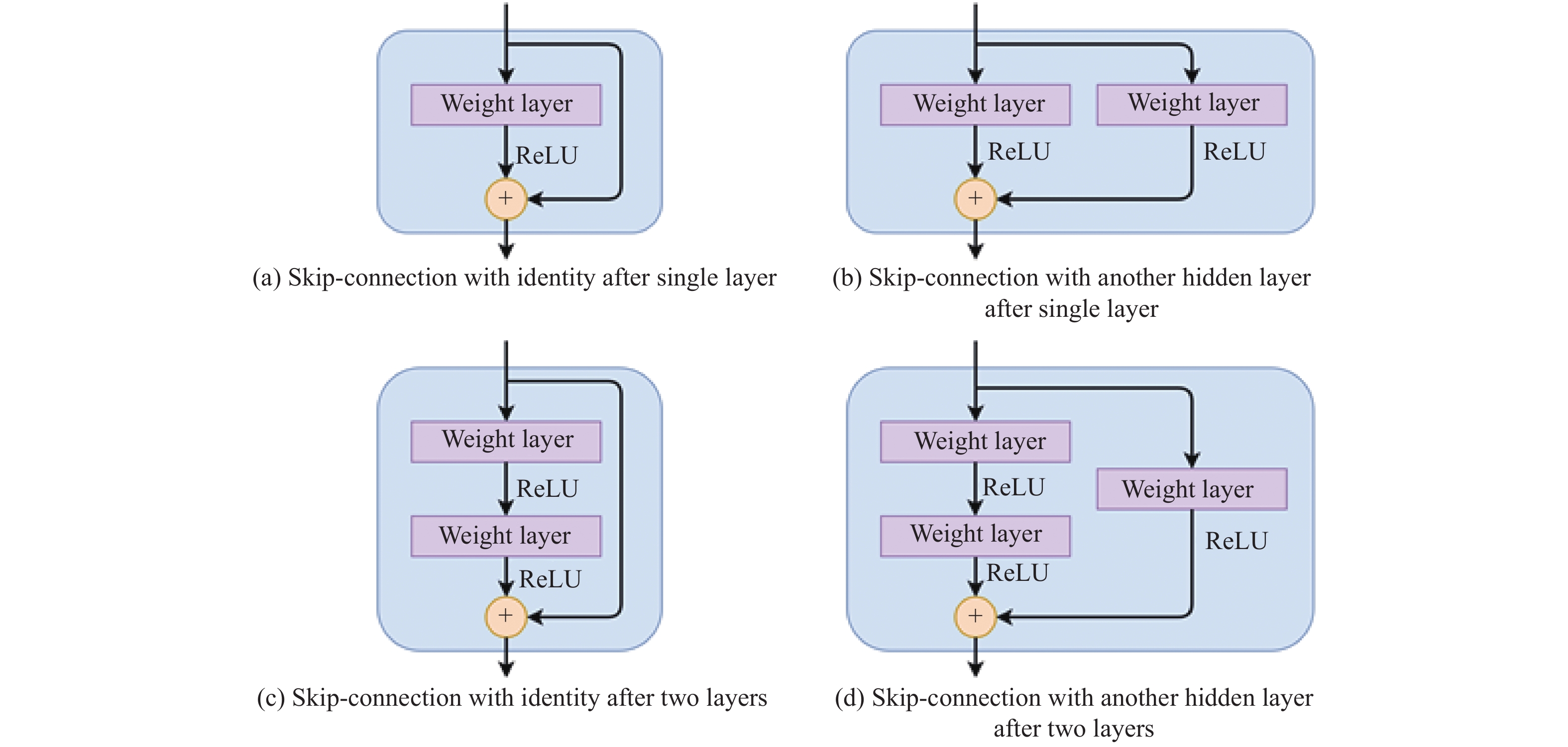 神经网络的性能在很大程度上依赖于神经网络结构的设计和其他超参数的选择,例如激活函数、优化器、初始权重值等。类似于其他超参数优化的研究[28-34],本文使用不同类型的小型结构对整个LSTM架构进行编码。图2展示了作为LSTM主体网络组成构件的不同类型的小型体系结构。在这些小型结构中,每一个都采用了残差连接,因为它允许训练深度神经网络,而不会导致梯度消失的问题[35-36]。最终的LSTM网络是通过对这些组件进行排序来构建的。LSTM存储单元数和模块层数是与使用遗传算法优化的神经网络结构设计相关的另外两个参数。需要优化的其他超参数包括优化器的类型、优化器的学习率、权值和偏差的初始化分布以及激活函数。
