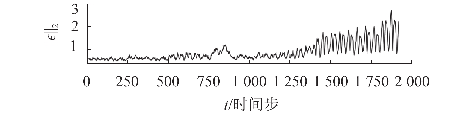 图5描绘了两个不同时刻的真实温度场和重建温度场。利用式(4)重建温度场,其中平均温度场是由前1500个数据快照计算所得。基于LSTM的ROM(降阶模型)能够准确地捕捉温度场中的大尺度模式,展现出数据驱动的ROM在地球物理流体分析中的应用潜力。图6展示了L2范数下的温度场真实值和预测值之平方误差。可以观察到,在最后的时间步,预测误差增加,这可能是由于模态系数预测不准确,以及POD基函数无法在外推时间域(即时间步超过1500)捕获高精度的空间模式。针对LSTM误差累积的一种补救方法是以非自回归的方式来训练和部署网络[37]。