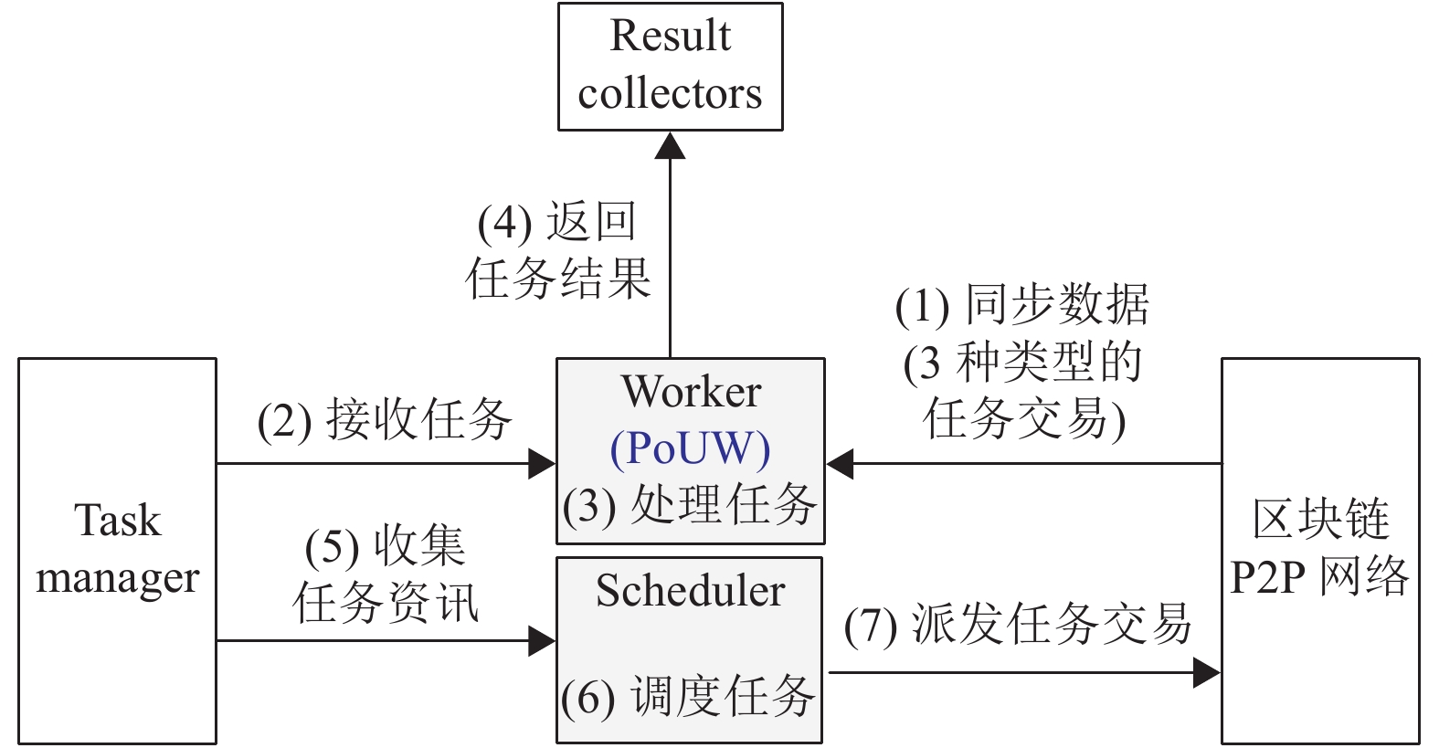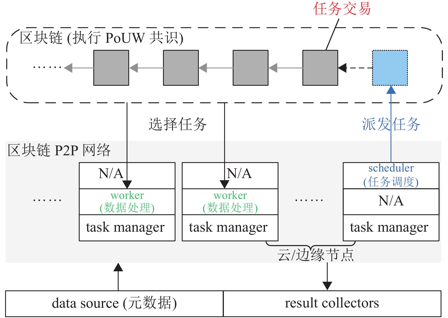 在本文中,对于不需要激励机制且可以忽略网络延迟的私有网络(如数据中心),本文改造了用于交易记录的区块链框架,使其成为具有去中心化控制的数据处理框架。也就是说,本文提出了一个基于区块链的去中心化数据处理框架。在所提框架中(如图1所示),采用PoUW共识的区块链存储任务交易。每个区块链节点扮演3个角色:task manager(任务管理器)、worker(工作者)和scheduler(调度器)。task manager从数据源收集原始数据;worker首先从区块链中选择任务并从task manage下载任务,然后在本地处理它们并将结果返回给结果收集器,之后执行PoUW以竞争成为scheduler的角色;scheduler将任务信息分发到区块链中。最后,通过模拟验证了该框架的有效性。在系统吞吐量和任务响应时间方面,本文提出的框架优于传统的基于主/从的框架。同时,本文的解决方案实现了与基于主/从的框架类似的公平性。
