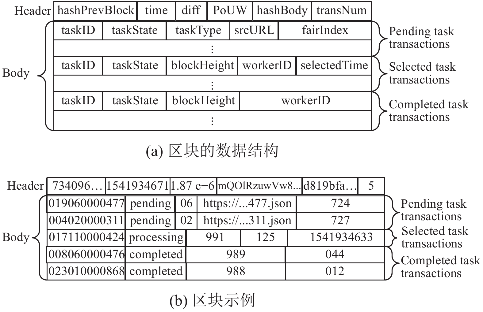 2.1 区块链交易在区块链中区块被用来存储任务交易,其中任务交易设定了一个任务的概况(如ID和类型)。如图2(a)所示,每个区块由2部分组成:区块头和区块体。