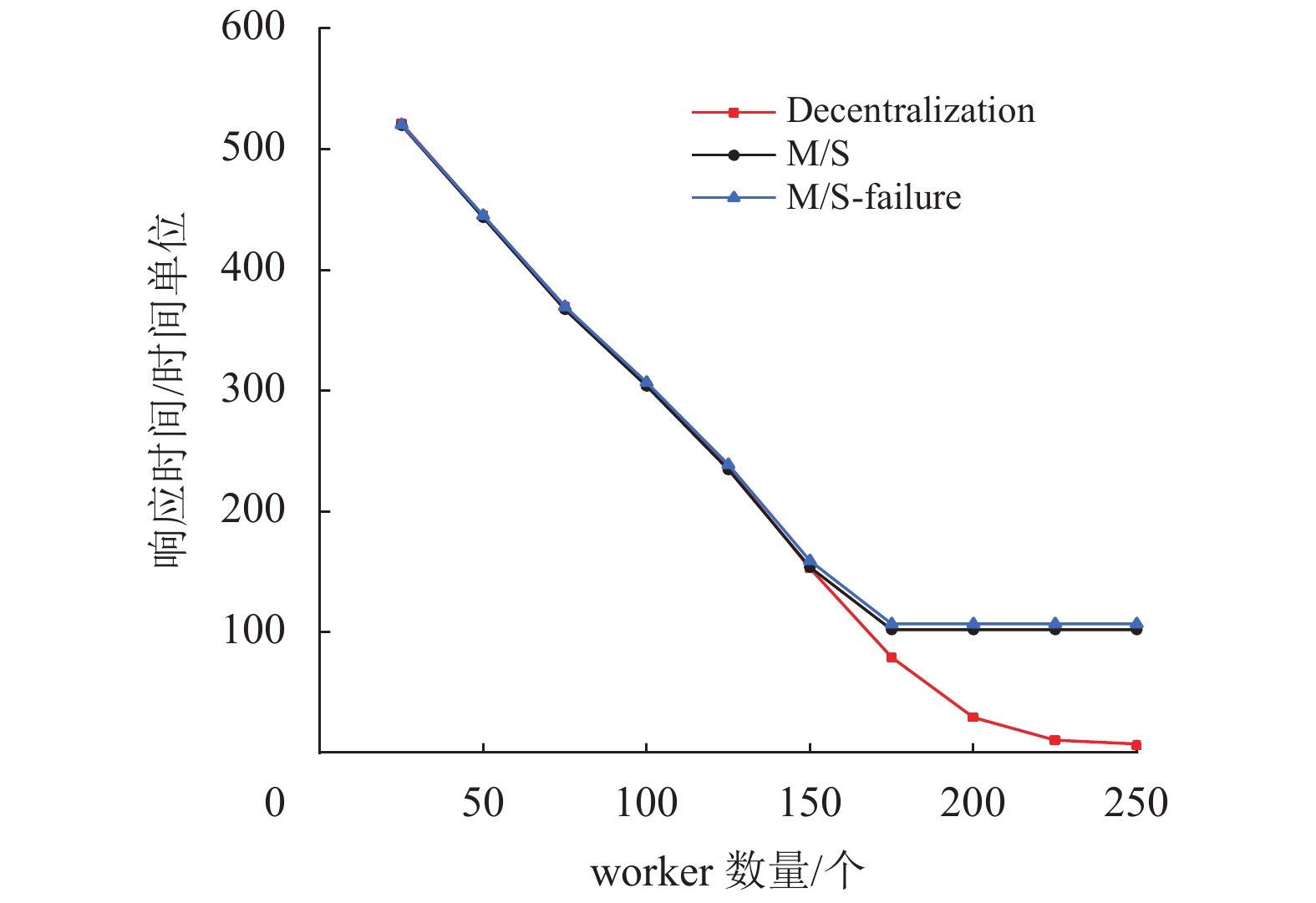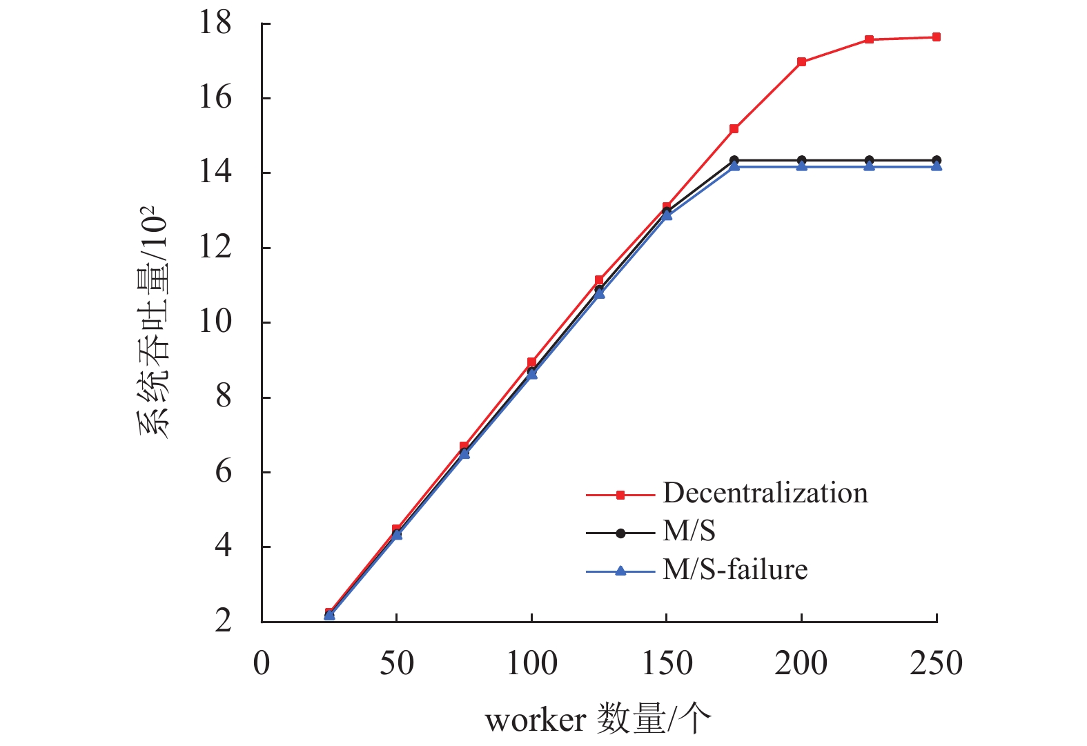 响应时间是指从任务生成到开始由worker处理的时间。响应时间越短,任务的处理就越及时。图5描绘了worker数量从25到250变化时的响应时间。从图中可看到,当worker数量少于150时,3种方案的响应时间几乎相同,并且随着worker数量的增加而几乎线性下降。当worker数量超过150人时,本文方案的响应时间下降得更快。由于主节点的瓶颈,当worker数量超过175时,M/S和M/S-failure的响应时间不再变化。