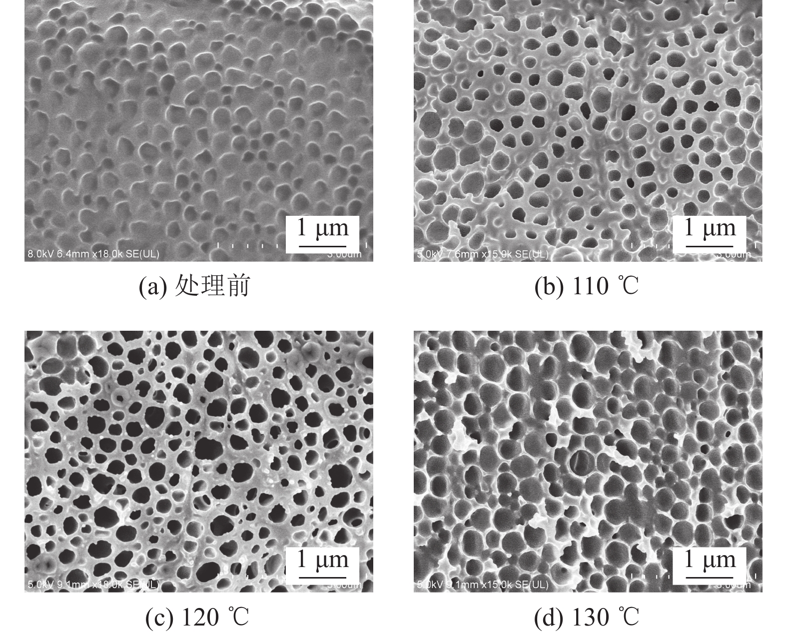 2 结果与讨论 2.1 黄豆结构图1(a) ~(d) 分别为热处理前以及110 ℃、120 ℃、130 ℃处理5 h后的微观结构图。由图1可以看到,处理前的黄豆内部存在一些浅坑,孔结构不明显,热处理后出现了明显的孔结构,并且在这3个温度中,120 ℃处理过的样品(S5-5) 的孔结构及尺寸最为均匀且密集,孔状为蜂窝状。经过运用软件ImageJ对样品S5-5的孔进行统计,得到S5-5样品的孔径约为(0.42±0.08) μm。后续将以样品S5-5为吸附剂进行吸附实验。