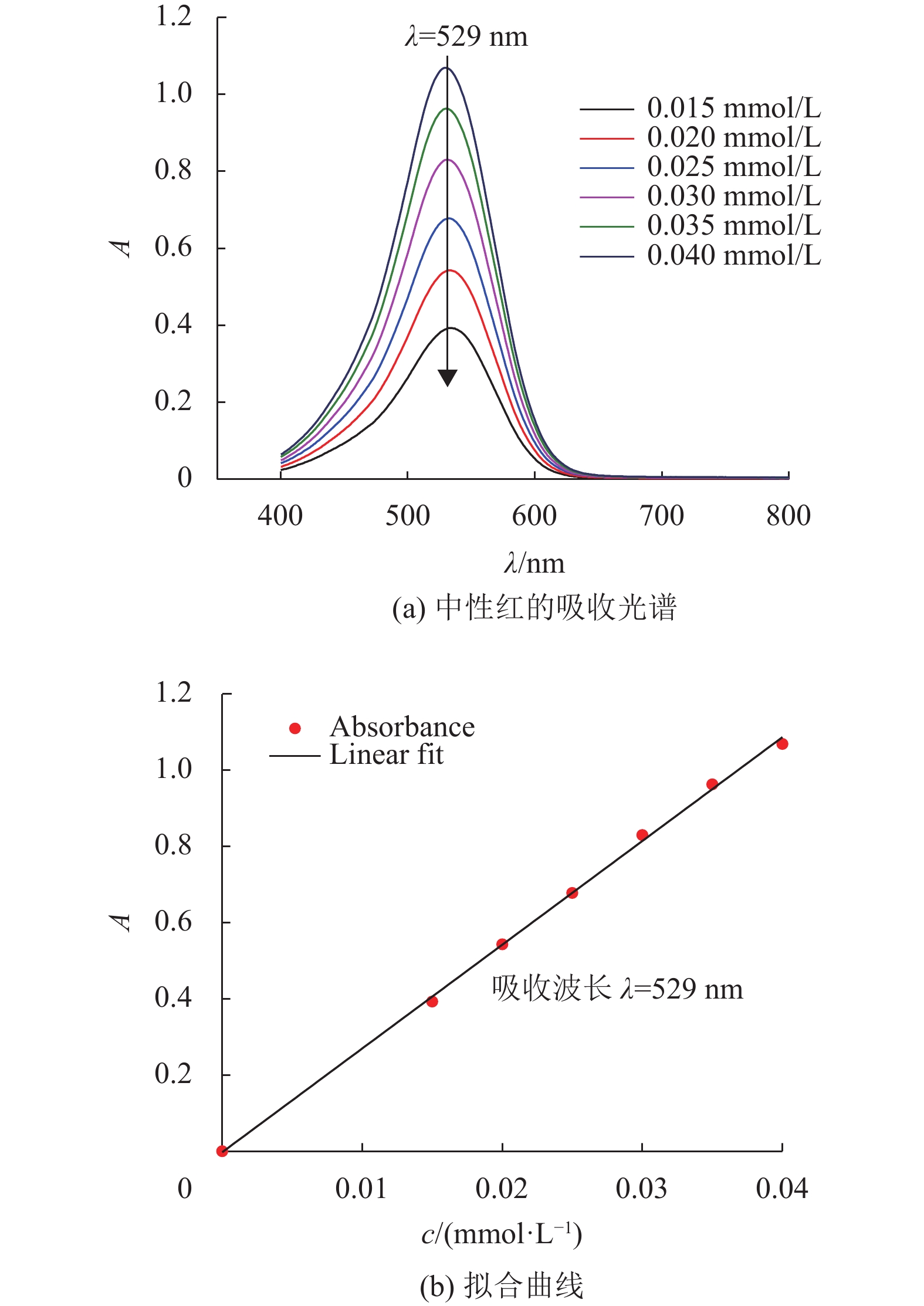 在吸收波长529 nm处,对中性红溶液物质的量浓度和此浓度对应的吸光度之间的关系进行拟合(见图2(b) ),得到式(4) ,此时相关系数R2为0.999。