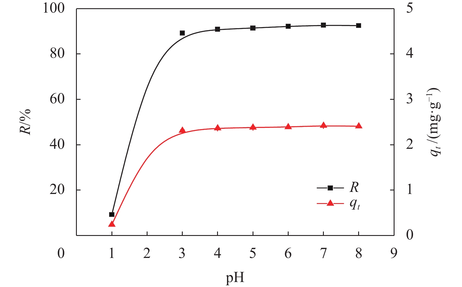 图 5 样品S5-5在不同pH值下的吸附曲线(c0=0.3 mmol/L) Figure 5 Adsorption curve of sample S5-5 at different pH values (c0=0.3 mmol/L) |