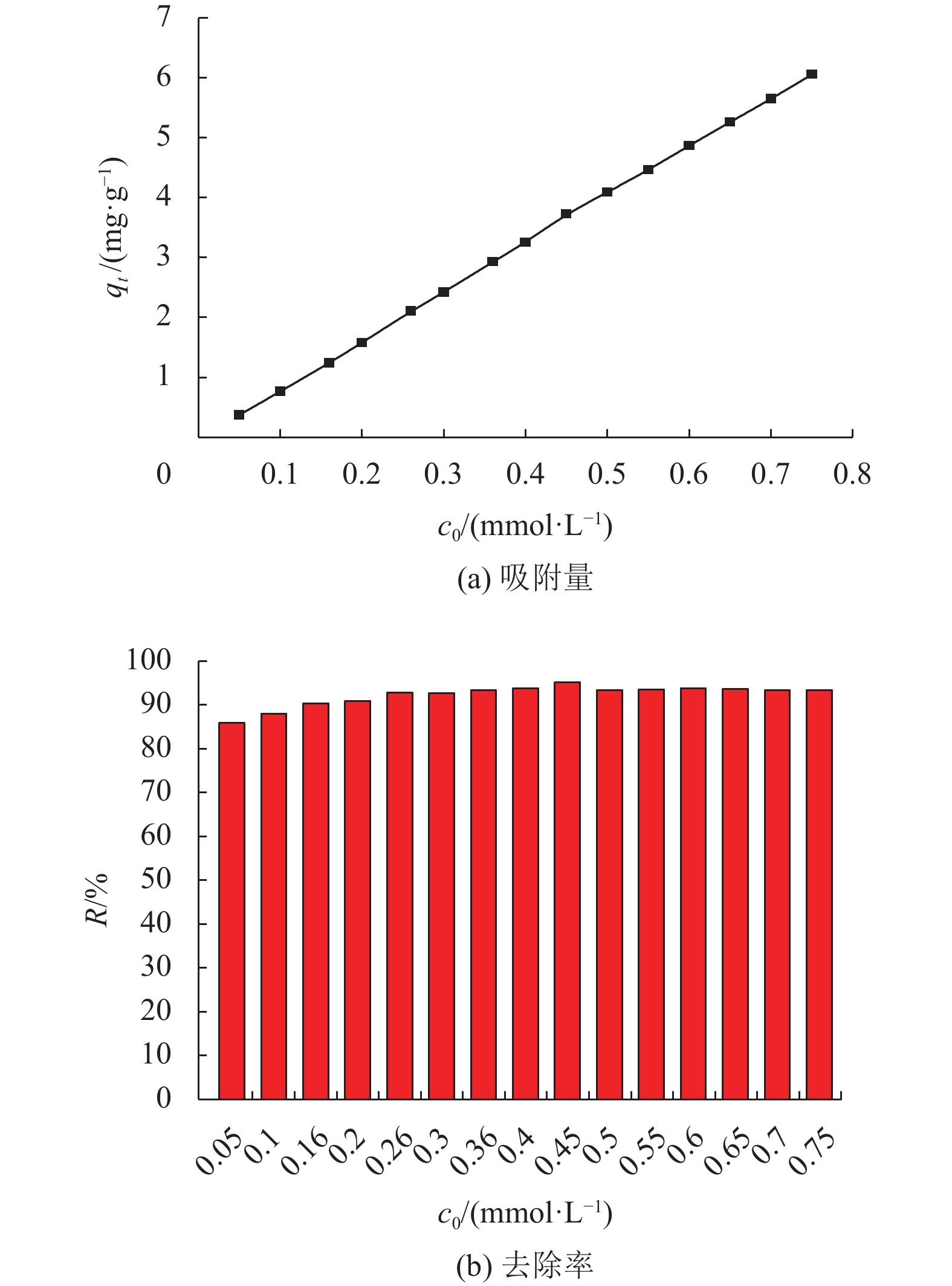 图 6 样品S5-5吸附量和去除率随初始物质的量浓度的变化图 Figure 6 Absorption capacityand removal rate as a function of initial concentration |