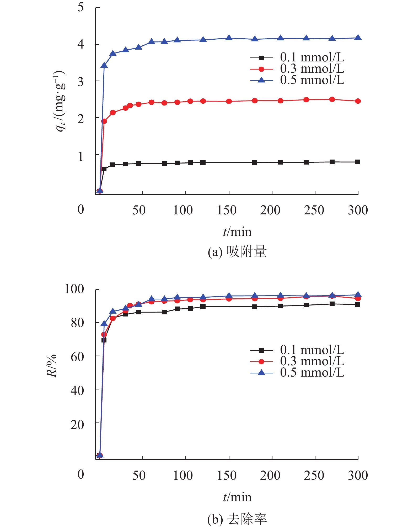 图 7 样品S5-5在不同初始物质的量浓度下吸附量及去除率随接触时间的变化曲线 Figure 7 Absorption capacity and removal rate as a function of time for sample S5-5 with different initial concentrations |