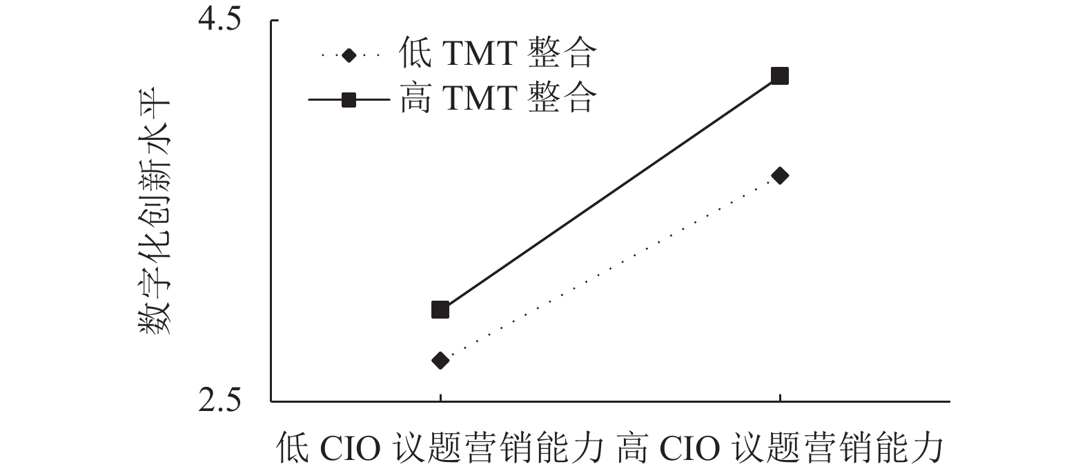 模型8和9中,调节变量TMT社会行为整合及其和CIO议题营销能力的交互项分别进入模型,结果显示交互项对企业数字化创新水平具有显著正向影响(β=0.064,p<0.05) ,故假设H5得到支持。为了更好地说明TMT社会行为整合的调节作用,绘制了图2所示的调节效应图,高TMT社会行为整合下所代表的实线比低TMT社会行为整合下代表的虚线更陡峭,表明TMT社会行为整合程度更高时,CIO议题营销能力对数字化创新水平的正向影响也更大,也即TMT社会行为整合正向调节了CIO议题营销能力对企业数字化创新的影响。