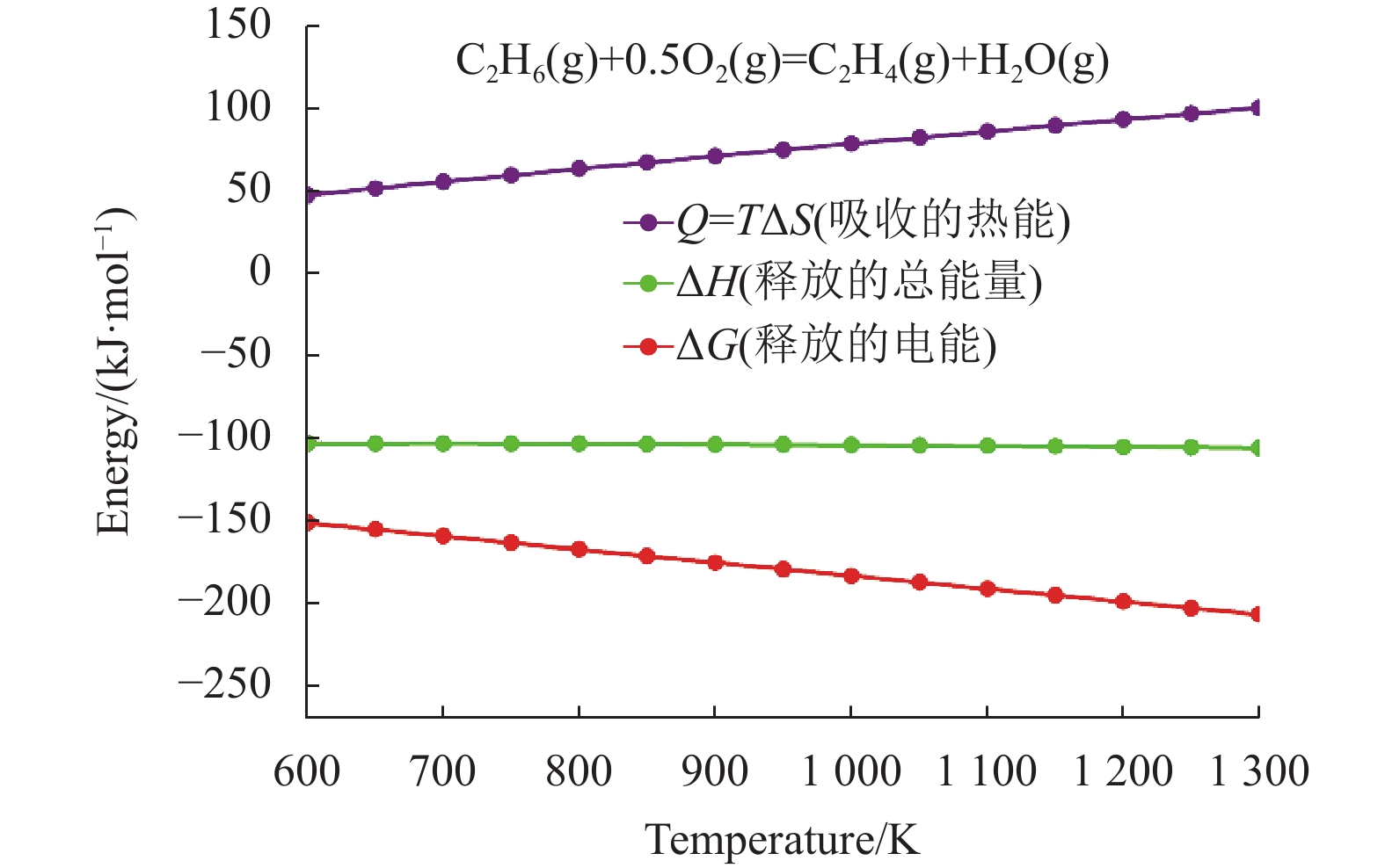 2 结果与讨论 2.1 热力学分析图2显示了不同温度下基于H-SOFCs制备乙烯的热力学计算结果。由图可知,在所示的工作温度区间内,反应的吉布斯自由能(