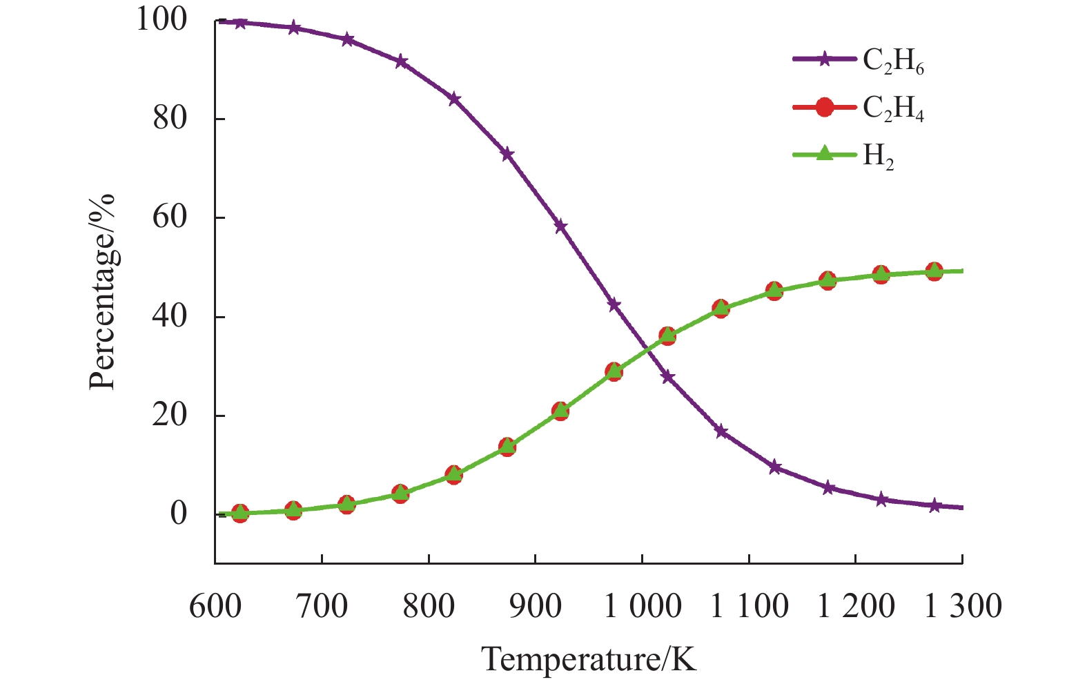 图 3 不同温度下,乙烷热分解的热力学平衡组分图(乙烯的选择性=100%) Figure 3 Thermodynamic equilibrium of ethane thermal cracking at various temperatures (ethylene selectivity=100%) |