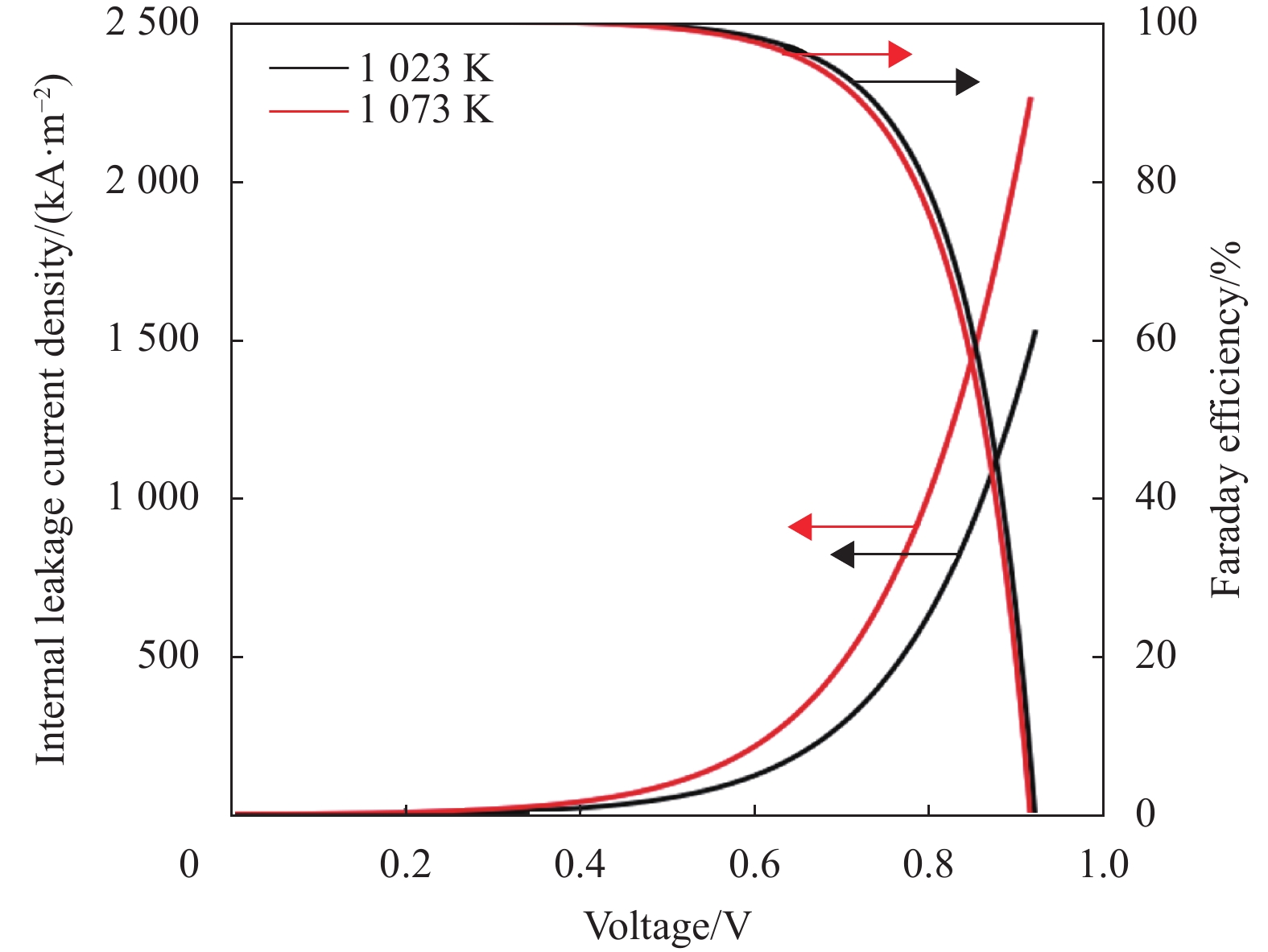 (2) 由于质子导体电解质存在不可忽略的电子电导,造成电池内部短路,形成泄漏电流,在开路电压处的泄漏电流密度高达2200 A/m2(1073 K) ,泄漏电流密度随着输出电压的减小而急剧减小。因此,在运行H-SOFCs时,设计合适的输出电压可以有效地减小泄漏电流的影响。