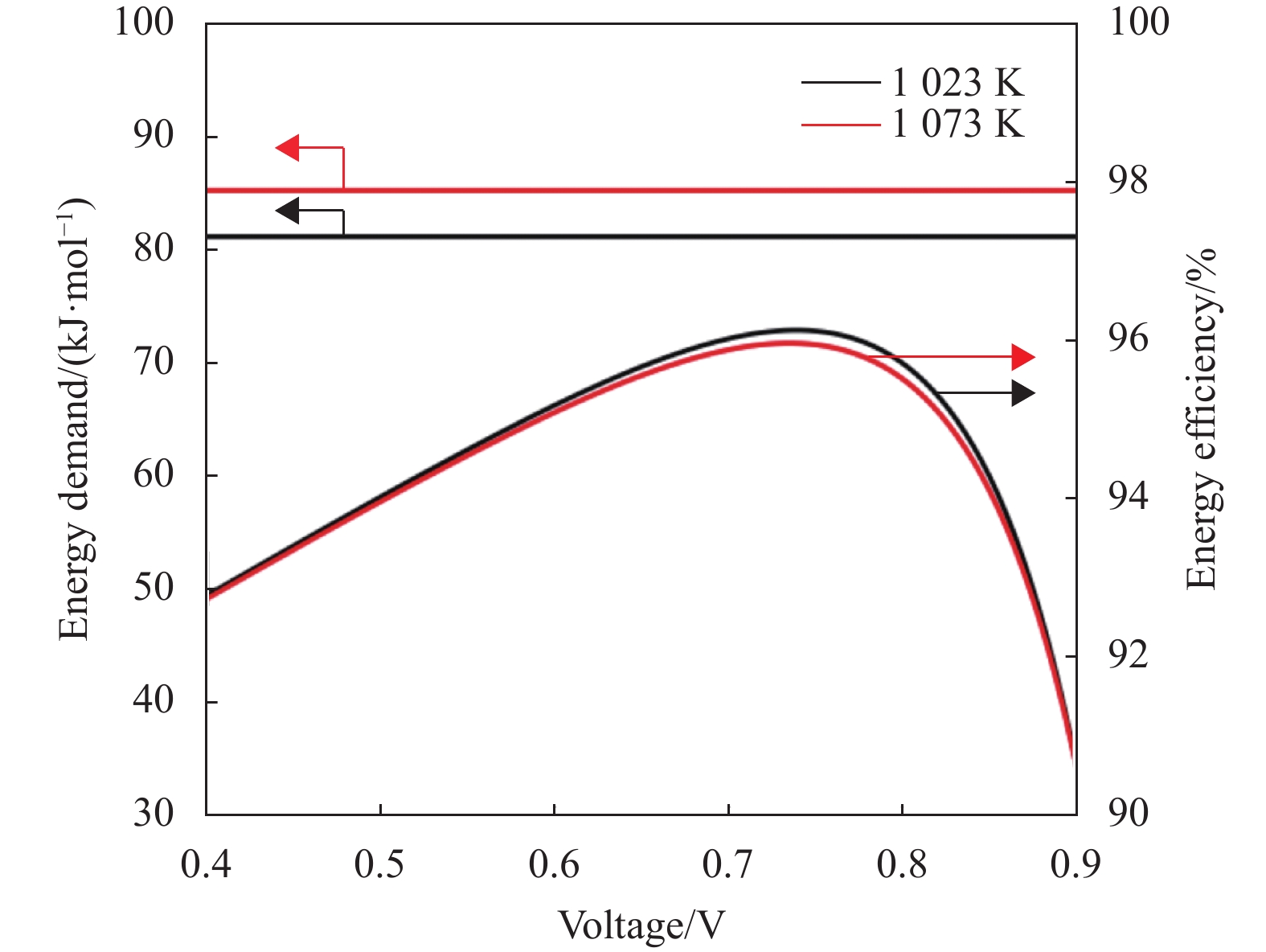 图 7 模型预测的产生1 mol乙烯的能量需求及能量效率与输出电压的关系 Figure 7 Model-predicted energy demand to produce 1 mole ethylene and energy efficiency as a function of output voltage |
