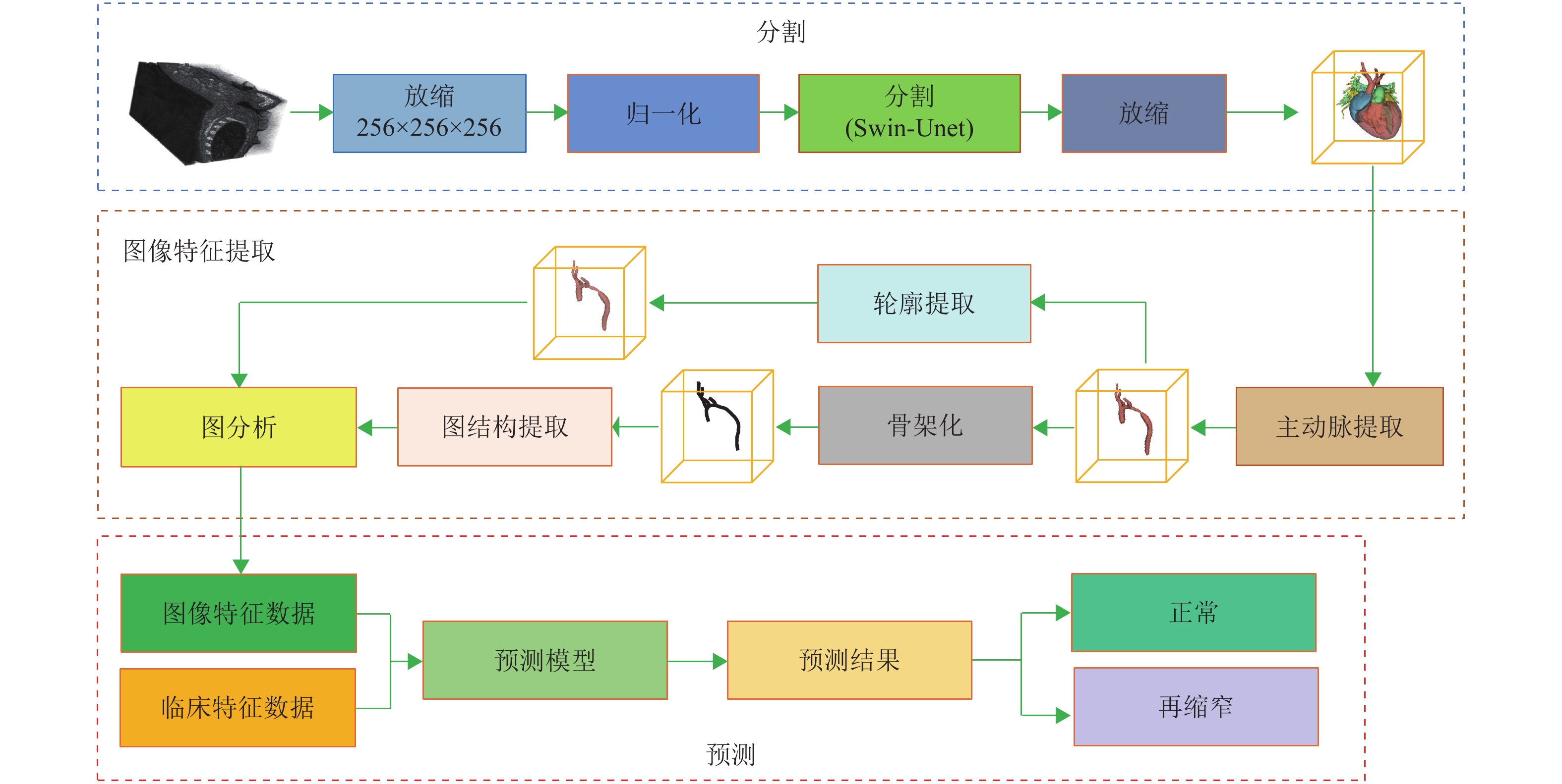 1 相关研究临床上,目前对主动脉术后是否会发生再缩窄的确切病因尚不完全清楚,目前的预测研究工作主要集中于主动脉再缩窄的风险因素的判定。主动脉再缩窄的风险因素判定主要基于两大类:(1) 基于病人手术后的临床和干预特征研究,文献[9-11]评估了术前前列腺素输注是否是再缩窄的风险因素还未形成一致结论,仅文献[9]确定其与主动脉再缩窄呈显著正相关;文献[10-12]确定手术所使用的缝合线的类型与再缩窄有正相关关系;文献[9, 12-20]中评估了主动脉缩窄手术修复策略类型与再缩窄的风险因素,文献[15, 17]认为补片主动脉成形手术与再缩窄正相关,文献[14]确定直接端对端吻合和斜吻合都是再缩窄的风险因素,文献[12]发现延长的端到端修复吻合术也是风险因素;文献[13, 16, 18]进一步发现通过球囊血管成形术进行的修复是再缩窄的高风险因素;文献[12, 15, 18, 20]指出术后峰值多普勒速度、介入治疗后收缩压梯度和出院前超声心动图上的残余缩窄均是与再缩窄显著相关的风险因素。(2) 基于形态测量特征研究,文献[11, 15, 20]评估了主动脉管径和再缩窄的风险,其中文献[15, 20]表明较小的主动脉管径与主动脉再狭窄的发生呈正相关,文献[11]还进一步证实主动脉横向管径每增加1 mm,再缩窄的风险就会降低。上述方法虽然对主动脉再缩窄预测提供了一定的辅助作用,但仍存在以下不足:(1) 上述研究分别从不同角度找出主动脉再缩窄的风险因素,无法从整体上进行综合考虑;(2) 特征选择范围窄,未充分考虑特征间的相关性;(3) 图像特征(例如主动脉管径等)的获得需要由经验丰富的医生基于CT图像后处理技术来展开手工测量,耗时且难以重复;(4) 为获取这些风险因素所造成的影响,需要较长时间的随访记录。
