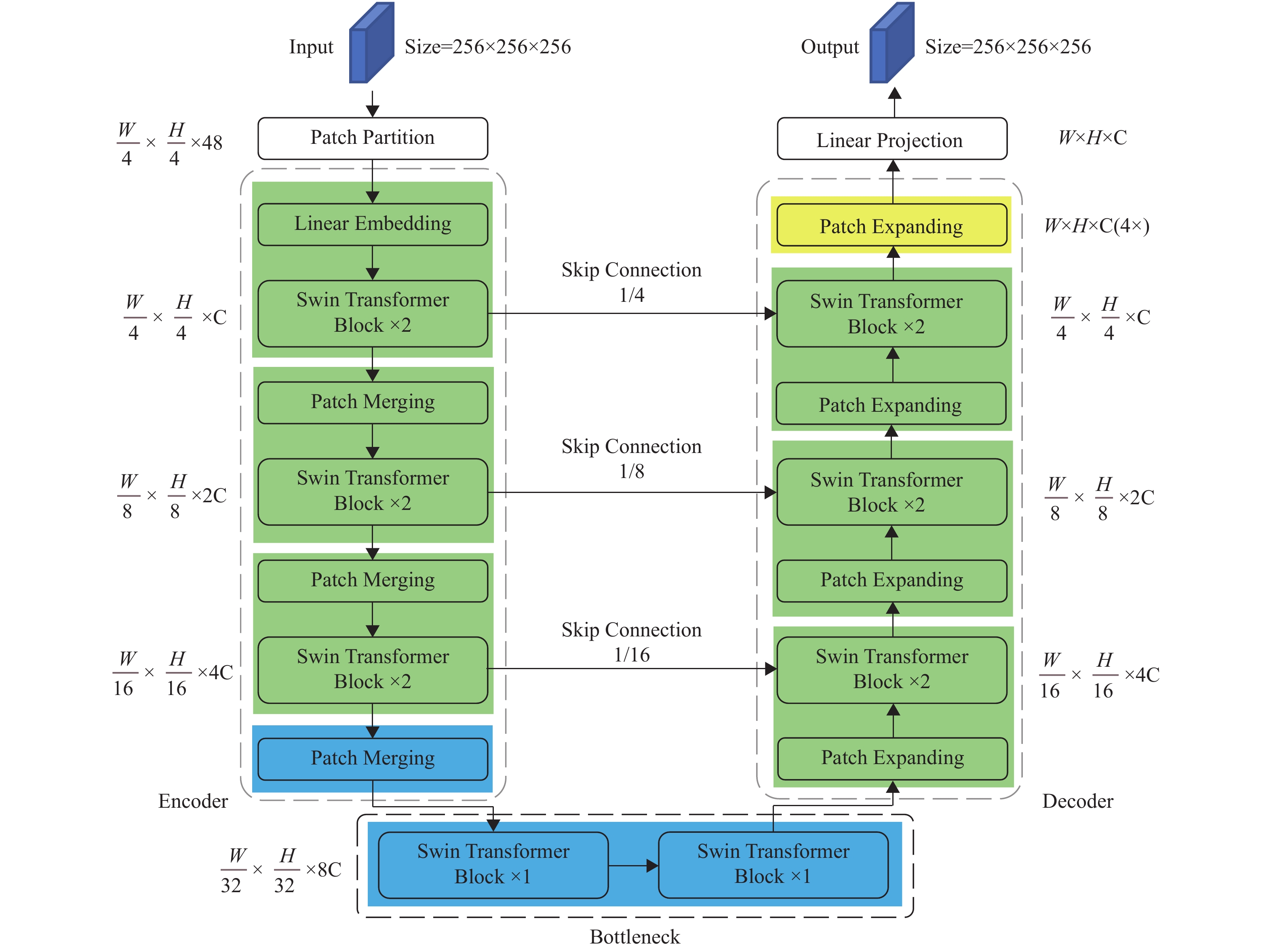 本文使用的Swin-Unet具体结构如图2所示。由于3D CT图像很大,包含大量的像素,若直接对原图进行分割,则会产生大量的计算量,容易造成计算机性能瓶颈。所以为了减少计算量同时提高分割的效率,首先将输入图像进行缩放处理,将3D CT图像从高分辨率空间512×512×Z(129~357) 缩放到低分辨率空间256×256×256后再进行归一化,将归一化后的图像输入至Swin-Unet进行分割。最后,再将分割后的图像放大至原图像的大小,得到最终的分割结果。