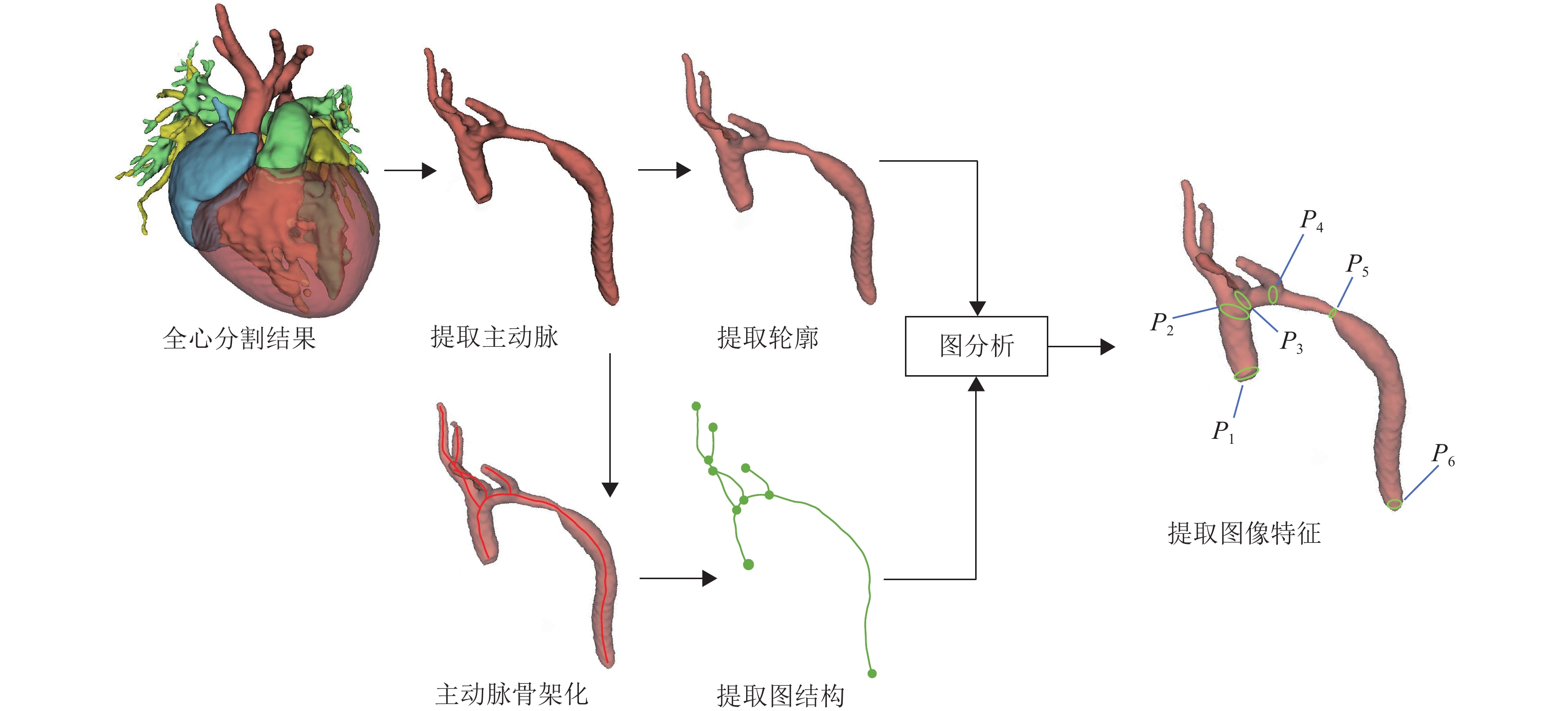 将主动脉进行骨架化,进一步地,通过骨架图像提取主动脉在升主动脉部位(P1)、近端主动脉部位(P2)、远端主动脉部位(P3)、峡部部位(P4)、缩窄部位(P5)和降主动脉部位(P6)的长径、短径、管径、周长和横截面积等图像特征。具体操作为:首先将骨架化的图像提取图结构,将图中度为1且Z轴最小的2个点作为起点(P1)和终点(P6),将P1与P6作为升主动脉部位与降主动脉部位的图像特征提取点。