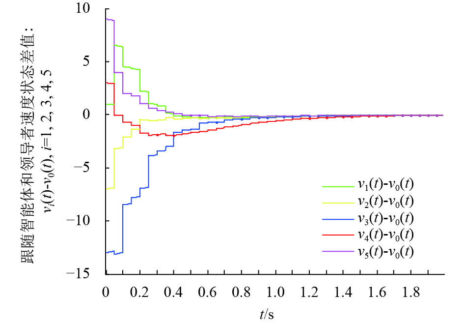 图4、图5表明:随着时间的增加,各智能体与领导者的状态误差逐渐趋于并稳定于0,实例证明了系统在脉冲控制协议作用下可以实现领导跟随一致性,即本文协议的正确性得到验证.