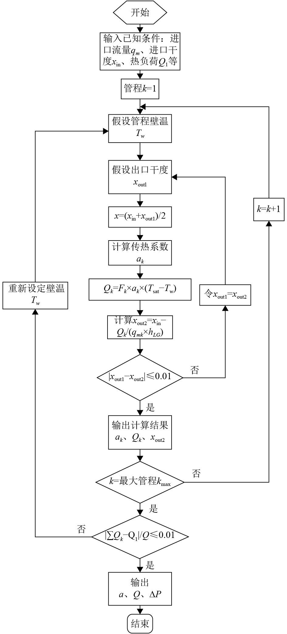 1.3 计算流程分液蒸发器的性能计算流程如图1所示,已知条件有:进口流量qm、进口干度xin、蒸发温度TSat、热负荷Q1、工质物性参数(由蒸发温度确定)以及分液蒸发器的管程分布. 分液蒸发器中的制冷剂截面质量流量和管程间的干度是非连续变化的,因此整个蒸发器的传热系数和压降需划分流程后逐程计算. 首先计算第一管程,令管程数k取1,假设第一管程的出口制冷剂干度值xout1和管壁温度Tw,得出平均干度x、相变潜热hLG和该管程换热面积Fk等参数,再平均分配质量流量计算得到管程中每根管内的工质质量流量qmk. 根据管内蒸发传热公式分别进行计算迭代,得到第一流程的管内平均传热系数ak、换热量Qk、出口干度xout2,如果xout2和xout1的偏差值超出设定的范围,则令xout1取xout2的值并重新进行迭代计算,直到计算的xout2达到预设的偏差范围时,输出xout2为下一个管程的工质进口干度,按同样的方法进行下一管程计算. 当管程数k达到最大值kmax时,如果所有管程的总换热量∑Qk与热负荷Q1的偏差值超出设定的范围,则重新设定壁温后继续迭代计算,直到计算的总换热量达到预设的热负荷偏差时,迭代计算结束,并输出所有管程的总换热量Q、平均传热系数a以及压降ΔP.