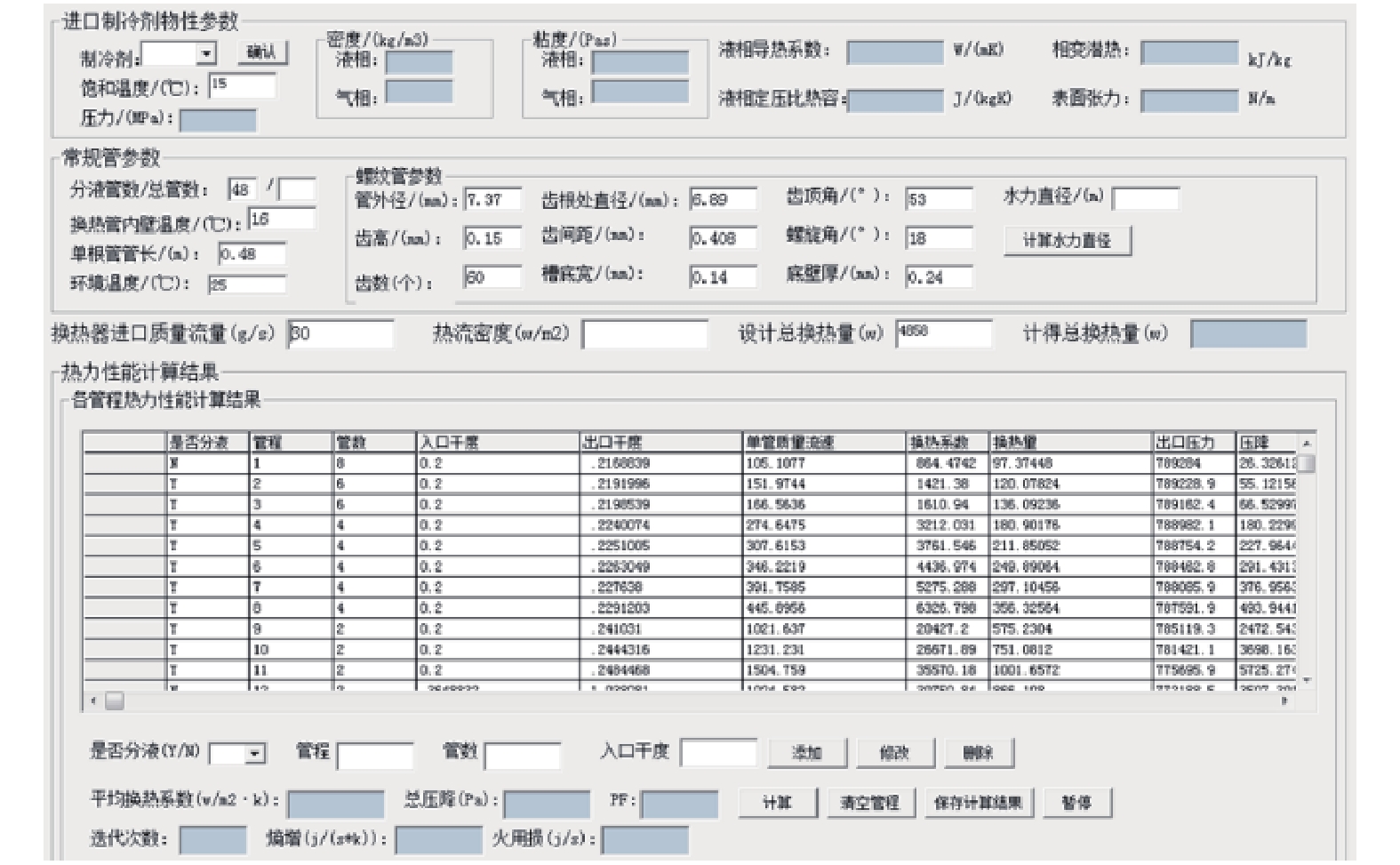 分液蒸发器热力性能计算程序界面如图2所示,图中程序界面分为3个部分:制冷剂物性、换热管参数、热力性能计算结果. 其中换热管参数根据蒸发器设计的需要进行输入,制冷剂物性部分则通过关联制冷剂物性软件REFPROP9.1[14]根据初始设定值而获得,热力性能计算部分采用分管程独立计算设计,可按照排列组合的法则穷尽所设定总管数和管程布置来计算分液蒸发器的热力性能,同时管程的制冷剂进口干度可在0.0~1.0之间任意选择.