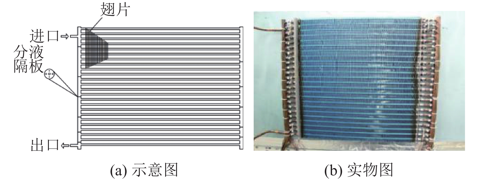 分液蒸发器主要由换热管、联箱以及百叶窗式翅片3部分构成,联箱中设有多个分液隔板,将不同数目的换热管划分成不同的管程,形成了若干管程串联的分液蒸发器结构,图3为一个12管程的蒸发器结构示意图及实物图.