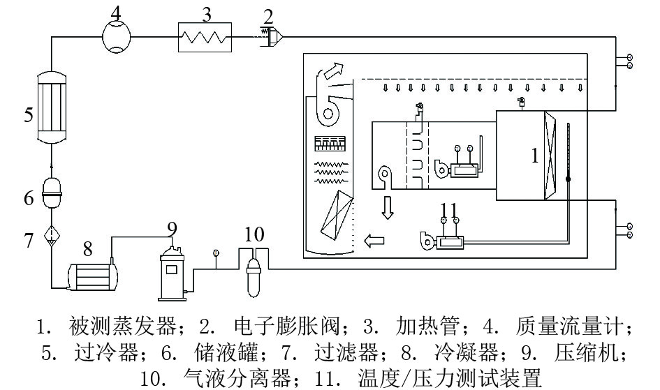 图4是空冷式翅片换热器测试平台,测试平台由3个循环构成,分别是制冷剂循环、冷却水循环以及空气测量与处理循环. 当气态制冷剂从压缩机排出,分别经过冷凝器、过滤器、储液罐、过冷器、质量流量计、加热管、电子膨胀阀,随后制冷剂进入测试蒸发器和气液分离器,最后重新回到压缩机. 空气侧为一个恒温恒湿的实验房间, 实验装置主要包括:空气处理机组、加湿器、加热器、循环风机、空气干湿球测温装置、风洞及风量测量装置. 在风量测量的出口位置连接一台变频风机调节风量.