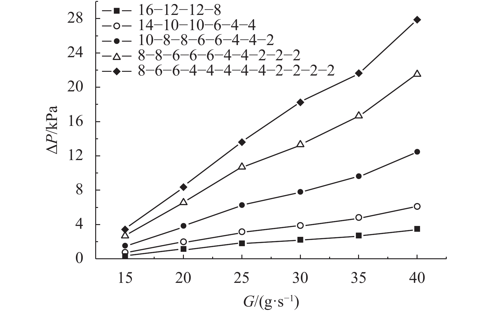 图9所表示的是5种分液蒸发器在R22的饱和温度为8℃,质量流速范围为15~40 g/s时压降的比较. 当蒸发器进口的质量流速由15 g/s增至20 g/s时,8-6-6-4-4-4-4-4-2-2-2-2管程、10-8-8-6-6-4-4-2管程和16-12-12-8管程的压降分别增加了58.7%、60.6%和63.3%,当蒸发器进口的质量流速由35 g/s增至40 g/s时,8-6-6-4-4-4-4-4-2-2-2-2管程、10-8-8-6-6-4-4-2管程和16-12-12-8管程的压降分别增加了22.4%、22.6%和22.7%,表明随着质量流速的增大,质量流速对分液蒸发器压降的影响降低,这是因为联箱的储液作用将过多的制冷剂积累在联箱内,使在换热管内的质量流速降低,使得压降值减小,加上管程间气液分离的作用,减少了进入下一流程的制冷剂,压降进一步减小.