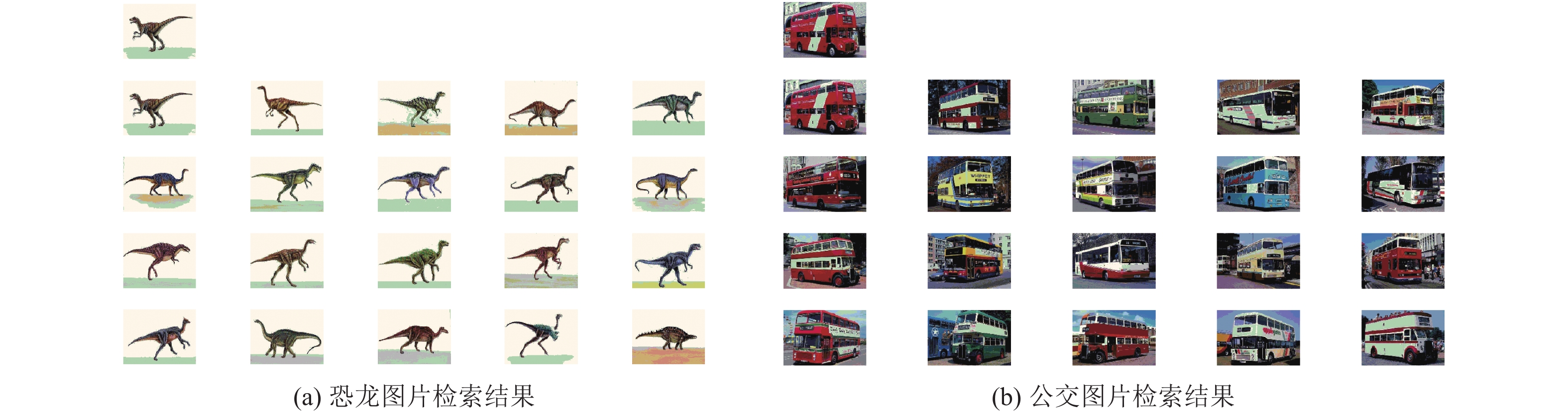 图 4 恐龙和公交图片的检索结果 Figure 4 The dinosaur and the bus image retrieval results |