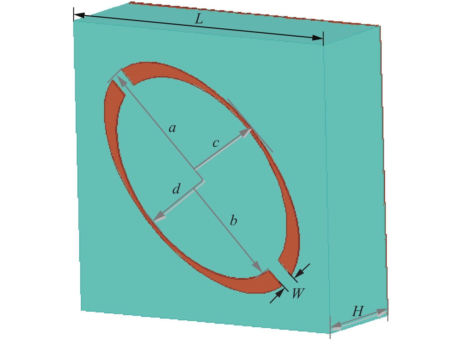 本文设计了一种超表面THz超宽带吸波体,该吸波体的单元主要由开裂的椭圆金环组成,其地板为金,两层金属中间是介质层. 其表面积只有72 μm×72 μm,该尺寸相对该吸波体的吸收中心频率(1.81 THz)为0.188 7 λ2,相对该吸波体的吸收最低频率(0.98 THz)仅为0.055 3 λ2. 在垂直入射条件下,设定最低吸收率为90%,得到该吸波体的吸波频段为0.98~2.64 THz,相对带宽为91.7. 同时,对于TE和TM极化,所提出的MA具有3个近乎完美的吸收点,频率分别为1.08,1.74和2.56THz,吸收率分别为99.8%,99.99%和99.37%. 与上述文献中的结构相比,该吸波体只用了一个开裂的椭圆形不规则环,就实现了超宽带吸收,同时实现了小型化和高吸收率.