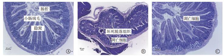 图 1 电离辐射诱导小鼠肠道损伤的十二指肠病理切片图(苏木精-伊红染色, ×200) Figure 1 Pathological section of duodenal injury induced by ionizing radiation in mice (hematoxylin-eosin staining, ×200) 图中, A:对照组; B:照射组; C:治疗组 |
