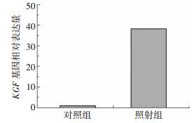 KGF有修复受损黏膜的功能,我们利用8 Gy γ射线照射小鼠腹腔后,十二指肠组织中KGF基因表达量显著增高,是对照组的38倍(图 2),差异有统计学意义(t=-125.55,P < 0.05),这表明机体通过KGF的高表达来修复电离辐射造成的损伤。