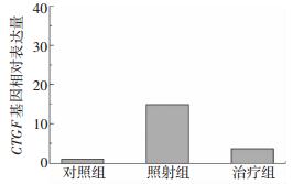 电离辐射可进一步通过炎性相关因子引起肠上皮细胞的损伤,治疗组CTGF基因表达与照射组相比显著下调,差异有统计学意义(t=4.89,P < 0.05);但照射组、治疗组中CTGF基因表达量均高于对照组,差异有统计学意义(t=-6.55,-3.10,均P < 0.05),结果见图 3。