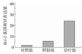 利用荧光定量PCR检测凋亡相关基因Bcl-2,结果显示,KGF给药后凋亡相关基因Bcl-2表达量与照射组相比显著上调,差异有统计学意义(t=-20.96,P < 0.05),且照射组与治疗组中Bcl-2基因表达量均显著高于对照组(t=-6.69、-40.65,均P < 0.05),这表明KGF对细胞凋亡起到了抑制作用,结果见图 4。