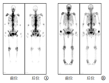 图 1 前列腺癌骨转移患者(男性,73岁)唑来膦酸联合89Sr治疗前后全身骨ECT扫描图像图中,A:治疗前;B:治疗后6个月,病灶数目较治疗前明显减少 Figure 1 Whole-body bone ECT scan images of prostate cancer patients with bone metastases before and after treatment with zoledronic acid combined with 89Sr |