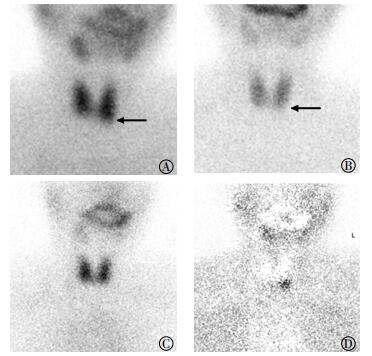 图 2 原发性甲状旁腺功能亢进患者(女性,58岁)99Tcm-MIBI平面显像图 图中,A:注射99Tcm-MIBI后5 min时(早期相)示甲状腺左叶下极见显像剂聚集(黑色箭头);B:注射99Tcm-MIBI后120 min时(延迟相)示甲状腺左叶下极显像剂聚集区减淡(黑色箭头);C:注射99TcmO4- 20 min时,正常甲状腺显像;D:将图A与图C进行数字化减影(减影相),显示甲状腺左叶下极见显像剂聚集,为甲状旁腺功能亢进病灶。MIBI:甲氧基异丁基异腈;99TcmO4-:99m锝高锝酸钠。 Figure 2 99Tcm-MIBI planar images of a patient with primary hyperparathyroidism |