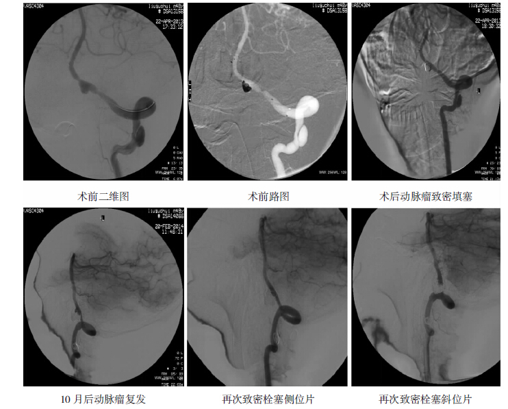 17例病人行支架辅助弹簧圈栓塞夹层动脉瘤,其中9例病人致密填塞动脉瘤,载瘤动脉通畅,8例大部分栓塞动脉瘤,载瘤动脉通畅。术后随访,9例致密栓塞者见1例动脉瘤复发(见图 2),予以再次行栓塞治疗,其余8例未见复发,均无出血及缺血表现。行球囊或弹簧圈闭塞椎动脉组:6例患者夹层动脉瘤均位于非优势侧,对侧代偿良好,术后随访均未见动脉瘤复发,未出现出血及缺血症状。行单纯支架置入术组:均为未破裂出血动脉瘤,12例行支架置入中有8例行单支架,术后随访,动脉瘤均处于稳定中,未见明显缩小及增大。另外4例行双支架重叠置入,术后随访,见1例动脉瘤明显缩小,造影剂滞留。另2例未见变化。观察组:6例未出血动脉瘤且未处理夹层动脉瘤者,6月~1年后随访见4例无明显变化,2例明显增大,遂行支架辅助弹簧圈填塞术,术中致密填塞。术后随访未见复发。(不同血管内治疗的效果见表 1)