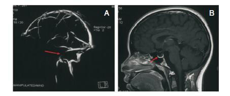 | 图 1 头颅MRV和MRI影像学检查。A:头颅MRV提示左侧乙状窦狭窄,箭头所示左侧乙状窦部分未显影;B:头颅MRI失状位可见空蝶鞍(箭头所示)。 |