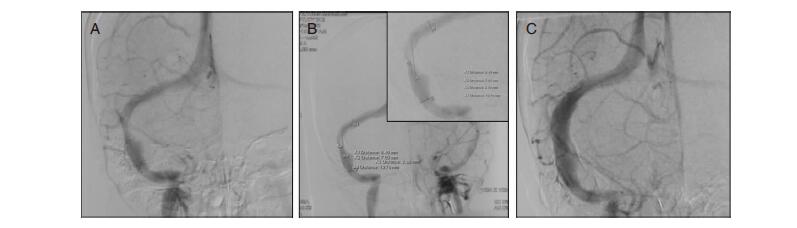 | 图 2 脑血管DSA所示。A:左侧乙状窦狭窄;B:狭窄处经测量长度约为19.76 mm;C:行支架植入术后狭窄显著改善。 |