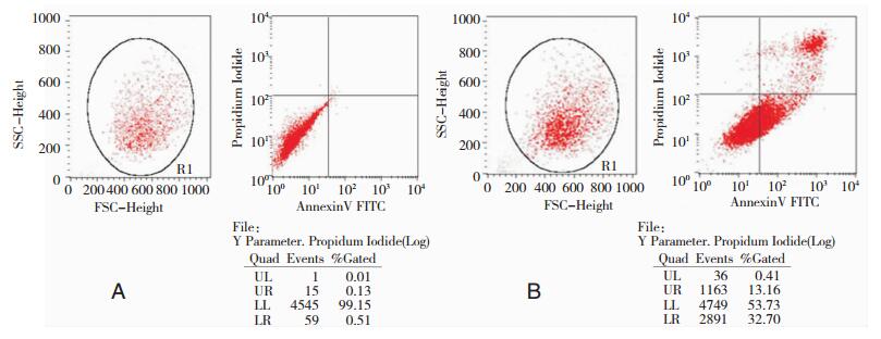 1.2.3 Annexin V-FITC/PI双染法检测细胞的凋亡率两组细胞处理5 h后,用不含EDTA的胰蛋白酶进行消化,以冰冷的PBS洗涤2次,离心(2000 rpm/min,5 min) 后收集细胞,收集约1×105~5×105细胞。除去上清液,滴入500 μl Binding buffer悬浮细胞,加入5 μl Annexin V-FITC及5 μl PI使用液使其混匀,置于室温下避光5~15 min后,1 h内采用流式细胞仪检测其荧光强度。正常活的细胞(双阴性细胞) 主要分布在流式细胞分析图中的左下象限(LL),Annexin V-FITC及PI均低染(Annexin V-PI-);早期凋亡的细胞或死亡的细胞分布在流式分析图的右下象限(LR),Annexin V-FITC高染而PI低染(Annexin V+PI-);晚期死亡或凋亡的细胞分布在图的右上象限(UR),AnnexinV-FITC及PI均高染(Annexin V+PI+)[5]。总凋亡率=早期凋亡细胞百分数(LR)+晚期凋亡细胞百分数(UR)。采用专业软件Cell Quest对所得到的数据进行收集、储存和分析。