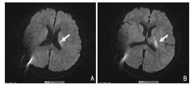 | A、B:提示左侧基底节区-侧脑室体旁新近梗死灶(箭头所示)。 图 1 头颅磁共振DWI序列 |
