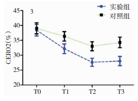 2组T0时CERO2水平对比,差异无统计学意义(P>0.05);试验组T1、T2、T3时CERO2水平较T0时升高,且高于对照组(P<0.05)。见表 3、图 3。